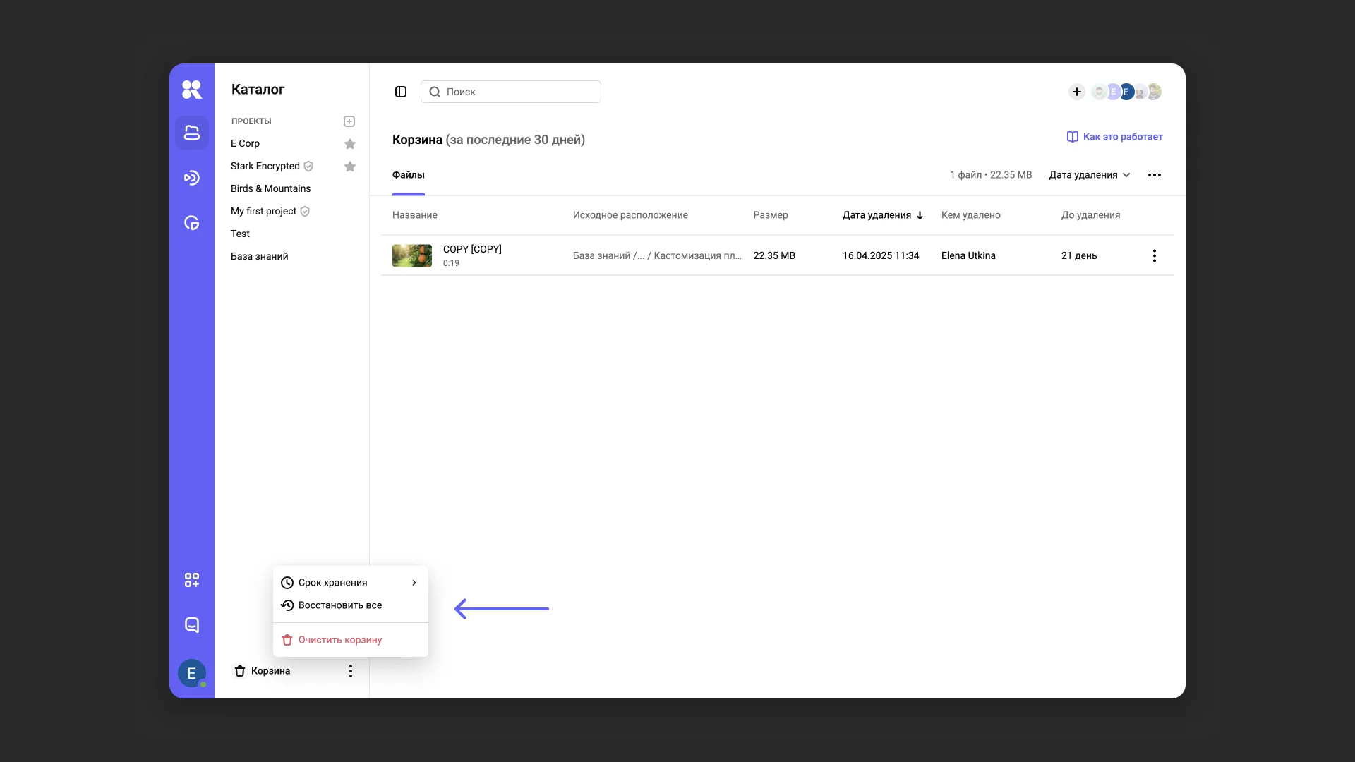 Удалённые файлы, проекты и папки перемещаются в корзину, где хранятся 30 дней — этот срок можно изменить. Случайно удалённые материалы легко восстановить, а ещё можно очистить место вручную, чтобы сэкономить на хранении.